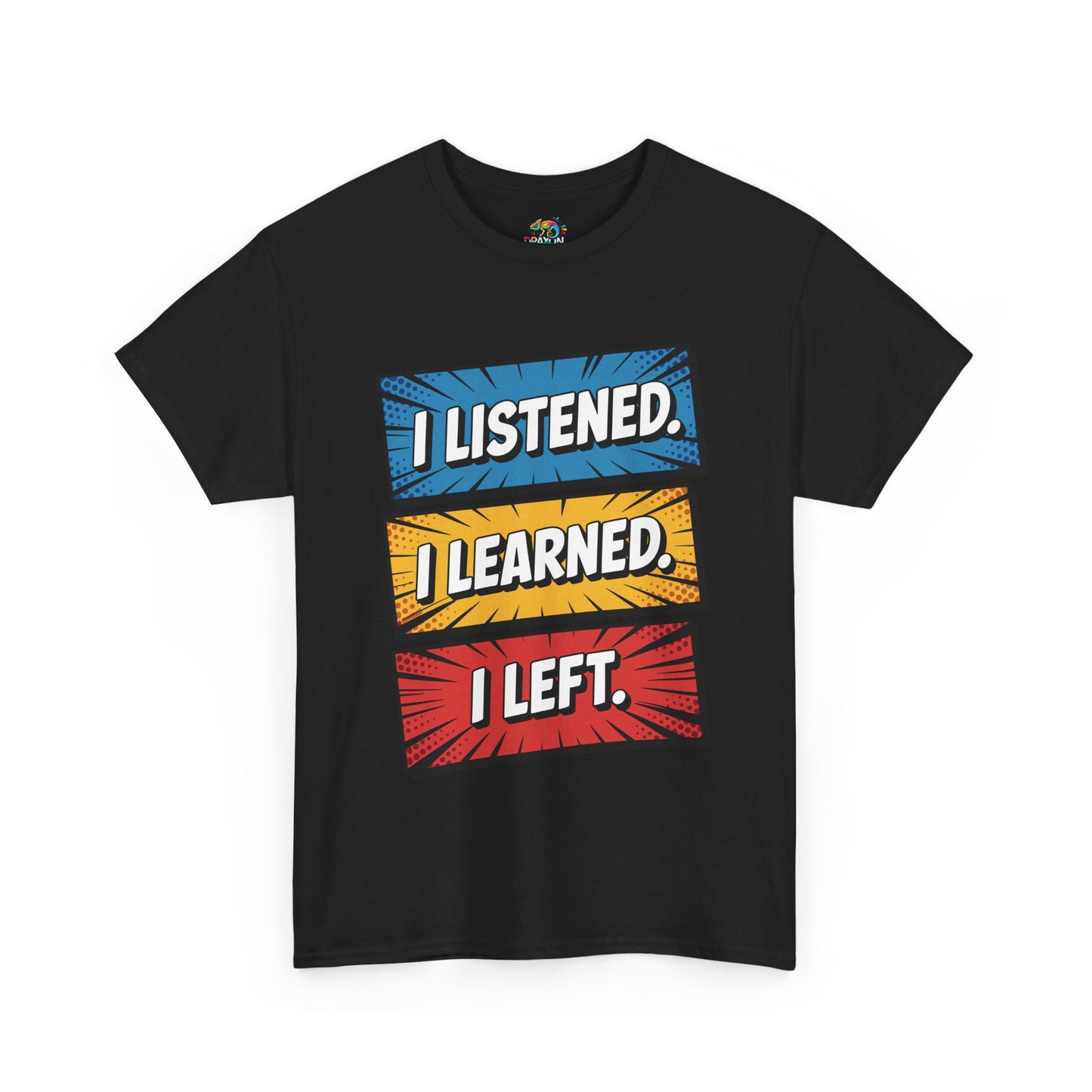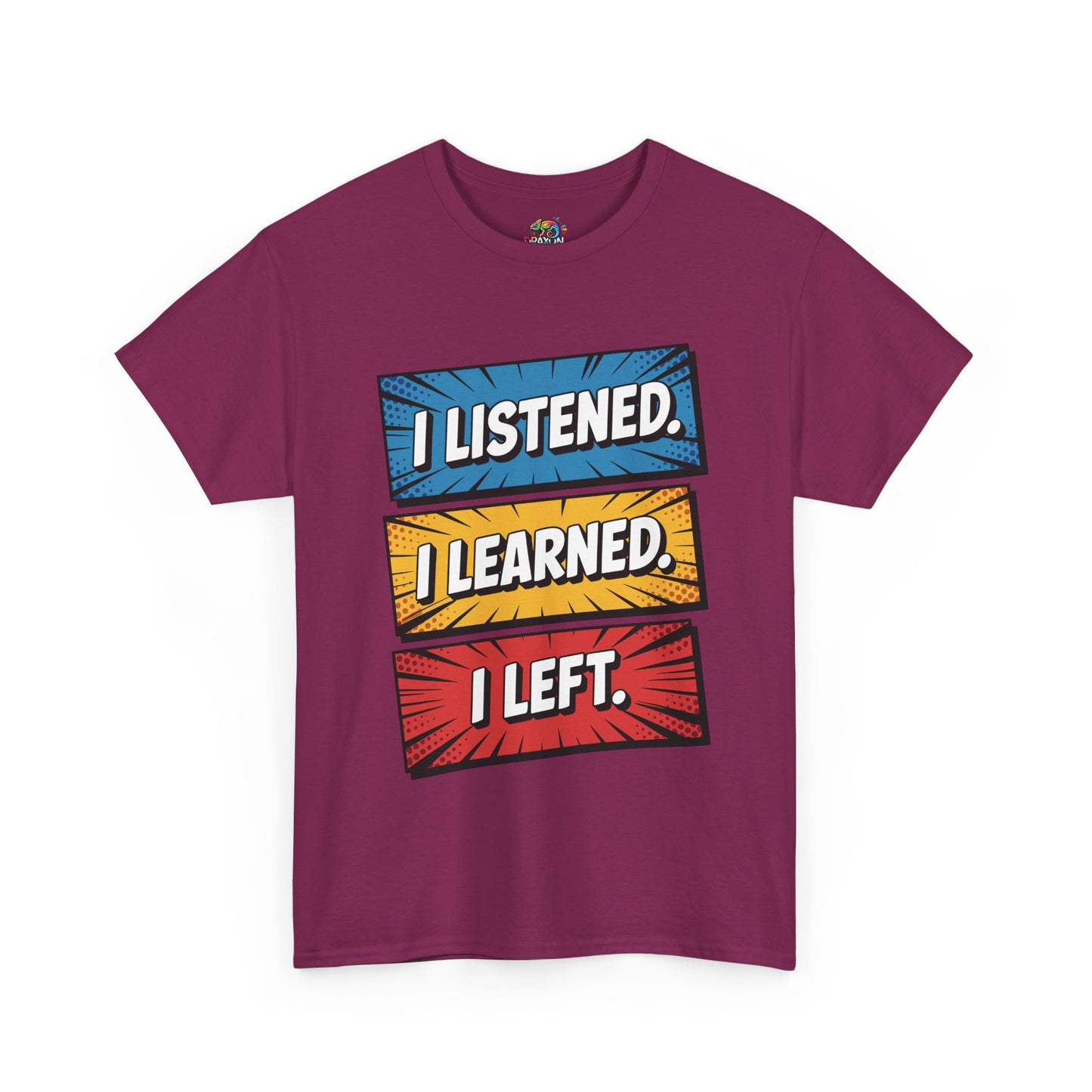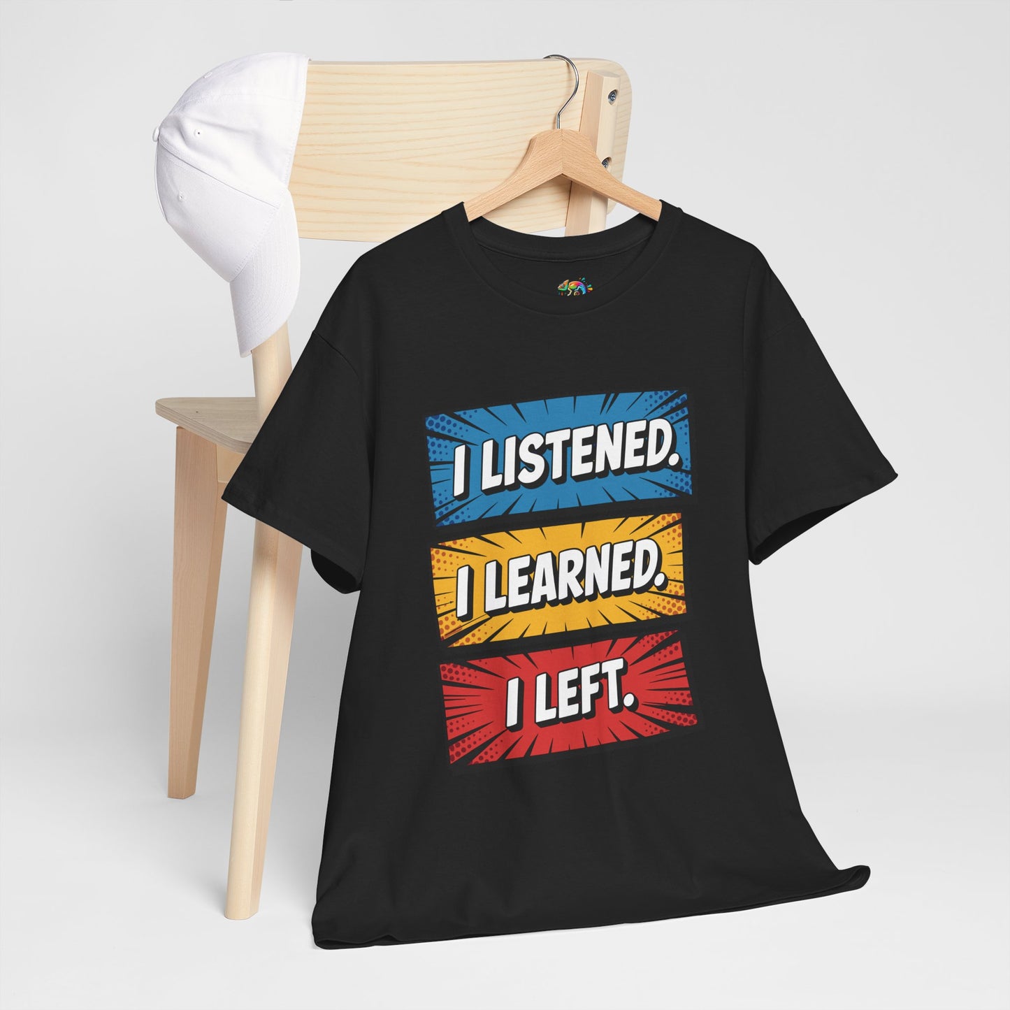 The unisex heavy cotton tee is the basic staple of any wardrobe with 'I Listened, I Learned, I Left'. The specially spun fibers provide a smooth surface for premium printing vividity and sharpness. No side seams mean there are no itchy interruptions under the arms. The shoulders have tape for improved durability.